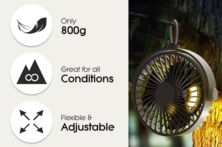 With a single snap, this gamechanger will hang above your camp and will provide strong light, blow air (keeps all flies away), and be used as a power-bank.
